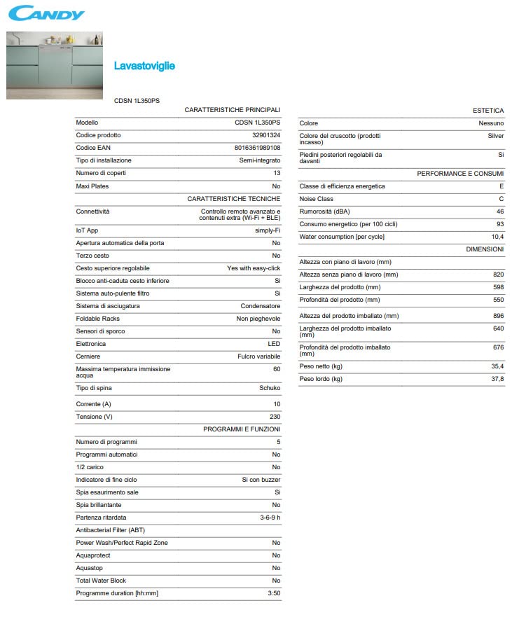 Specificaties: Candy Brava CDSN 1L350PS Inbouwvaatwasser, half geïntegreerd, 13 cijfers, smart, wifi + Bluetooth, 59,8 x 55 x 82 cm, uitgestelde startfunctie, roestvrij staal, klasse E